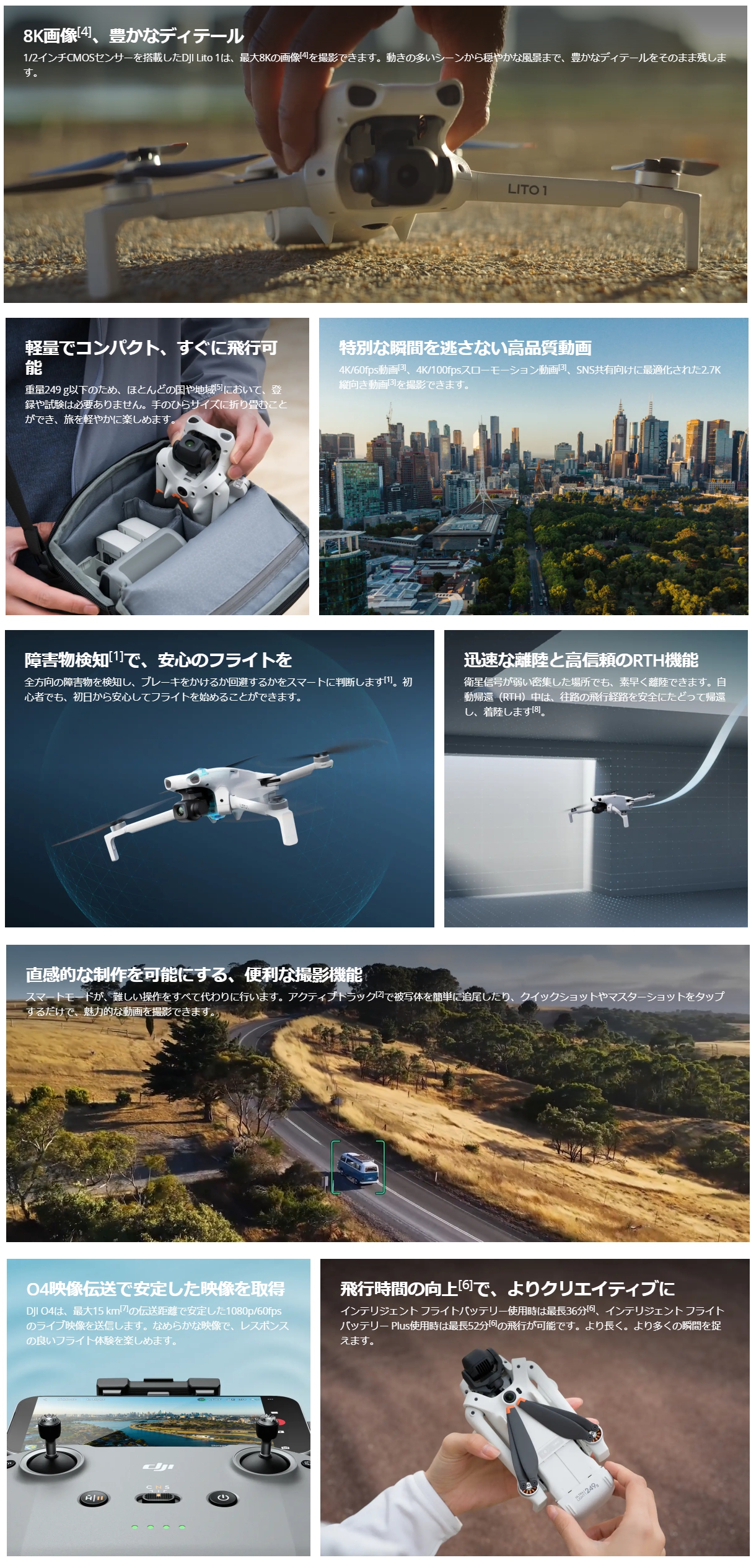 全方向障害物検知 で、安心・安全な飛行 アクティブトラック で、シネマティックな映像を手軽に撮影 4K動画 、8K画像 249 g以下 、軽量設計&優れた携帯性 十分な飛行時間 で、じっくり撮影を楽しめる スムーズで安定した15 km映像伝送 DJI RC-N3送信機、インテリジェント フライトバッテリー3個、充電ハブ、ショルダーバッグなどが付属しています。