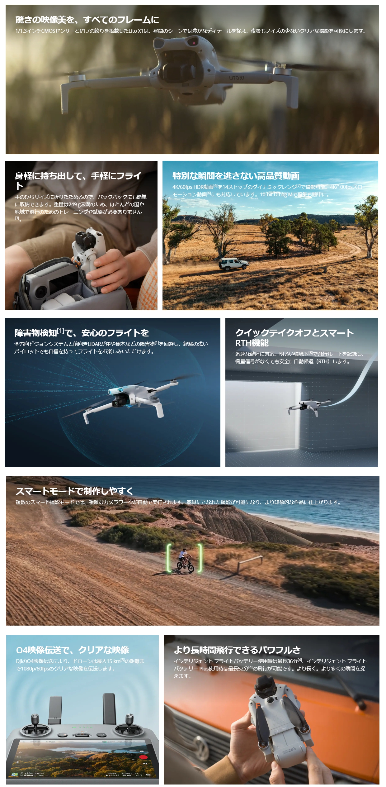全方向障害物検知 と前向きLiDARで、安心・安全な飛行 アクティブトラック で、シネマティックな映像を手軽に撮影 1/1.3インチ センサーで、プロレベルの映像品質 249 g以下 、軽量設計&優れた携帯性 バッテリー長時間駆動 で、たっぷり飛行を楽しめる スムーズで安定した15 km映像伝送 DJI RC 2送信機、インテリジェント フライトバッテリー Plus 3個(各バッテリーで最大52分の飛行が可 能)、充電ハブ、ショルダーバッグなどが付属しています。